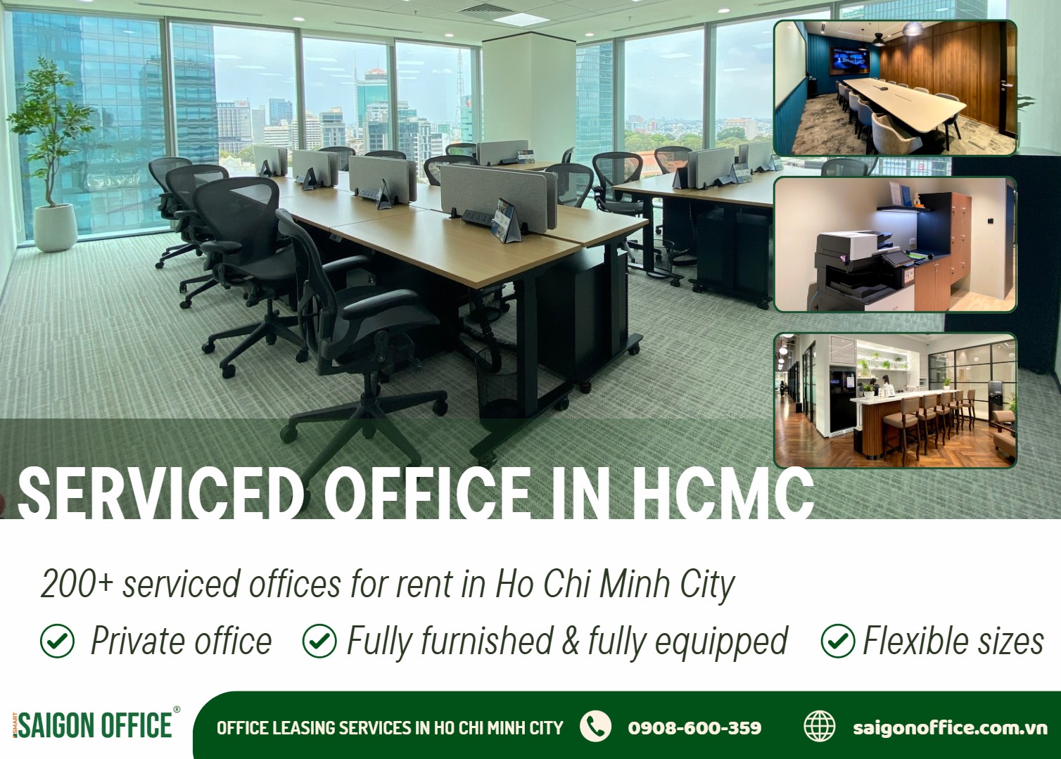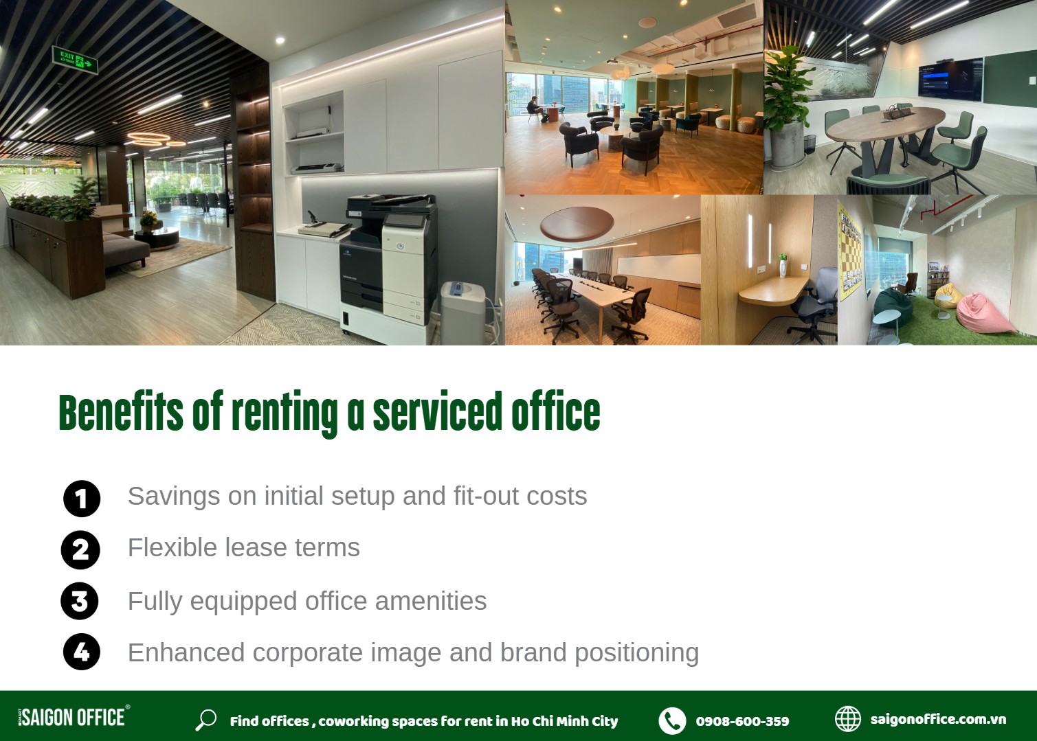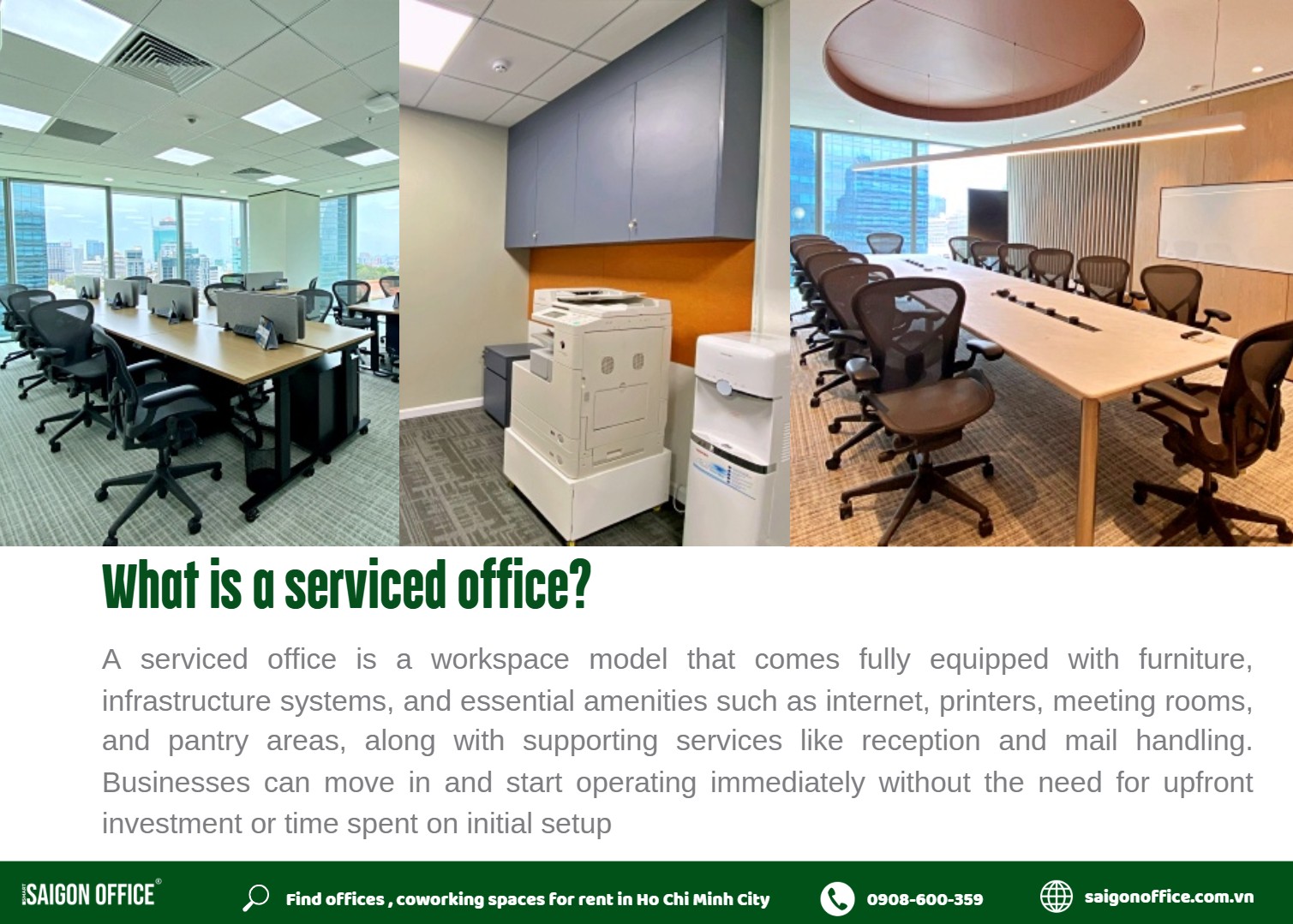Serviced offices are a highly viable solution for small and medium-sized businesses thanks to their flexibility and convenience. If you are looking for a fully equipped serviced office in a prime location, please contact Saigon Office at 0901 413 388 for the best consultation and support.